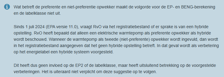 Omdat er twee verschillende opwekkers in het systeem zitten, wordt er ook gevraagd het vermogen van de twee opwekkers in te voeren. Dit vermogen wordt gebruikt om de warmtevraag te verdelen over de twee opwekkers. De verdeling van de warmtevraag over de twee opwekkers gebeurt aan de hand van de energiefractie. Vabi EPA berekent deze waarde per opwekker, zowel voor de winter als zomermaanden, op basis van de opgegeven vermogens en de standaardprioritering van de opwekkers. Opwekkers met een hoge prioriteit geven altijd als eerst warmte. De overgebleven warmte wordt vervolgens geleverd door de opwekkers met een lagere preferentie. Deze volgorde van opwekkers is beschreven in tabel 9.1 van de NTA 8800: