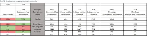 Het verschil in infiltratieverlies is te verklaren door het gebruik van een andere manier van berekenen. In 2017 werd er gebruik gemaakt van een tabel waarin de infiltratie per m2 gevel gevonden kon worden. Dit werd gecompenseerd met een Z-factor. In 2023 wordt het totale infiltratieverlies meteen berekend aan de hand van een specifieke qv10.