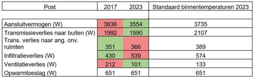 De ontwerpbinnentemperaturen die toegepast worden in 2023 zijn iets hoger dan in 2017. Dit zorgt in dit geval voor een verhoging van het transmissieverlies, en dus van het totale aansluitvermogen.
