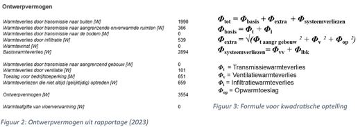 Figuur 2: De posten die in de rapportage boven ‘Warmteverliezen die niet altijd (gelijktijdig) optreden’ staan, worden in 2023 kwadratisch bij elkaar opgeteld, in plaats van direct (2017). Dit wil zeggen dat de totale uitkomst lager is; 101+651 ≠ 659. De formule is aangegeven in figuur 3. Deze manier van optellen zorgt hier voor een verlaging van het totale aansluitvermogen.