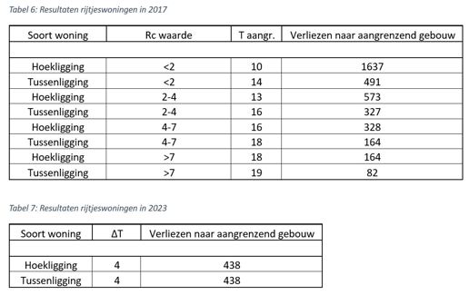 abel 6 en tabel 7 is te zien dat de nieuwe rekenwijze in dit project slechts in drie gevallen beter uitpakt. In 2017 werd er gerekend met een zekerheidsklasse (hier C), een ΔT afhankelijk van de Rc waarde (hoe hogere Rc hoe lager ΔT) en de ligging van de woning. In 2023 is dit een stuk versimpeld en wordt er eigenlijk alleen nog maar gekeken naar het aantal buren. De ΔT is vastgezet op 4 graden Celsius. We zien ook dat in 2023 de waardes voor verliezen hetzelfde zijn. Dit komt omdat er op ruimteniveau wordt gekeken in plaats van op gebouwniveau. Wat voor dit project betekent dat er geen verschil zit tussen hoekwoning en tussenwoning. Ook hier zie je, als in jouw project hoge Rc waardes zitten, het aannemelijk is dat het totale aansluitvermogen hoger wordt bij doorrekenen in 2023.