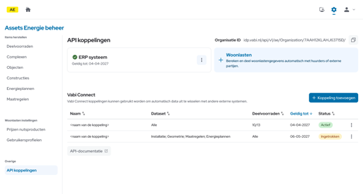 Preview van overzicht met API koppelingen binnen Vabi Assets Energie beheer