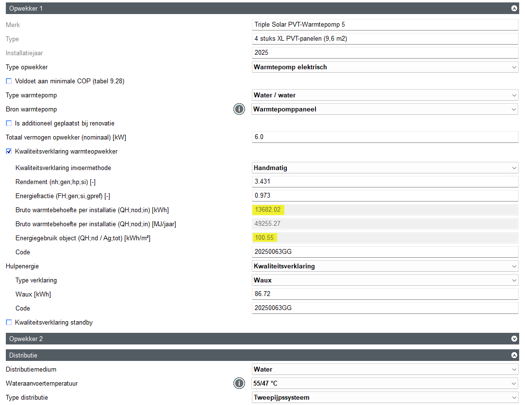 - Met deze twee waardes, een energiegebruik van 100,55 kWh/m² en een warmtebehoefte van 13682,02 kWh/jaar plus de wateraanvoertemperatuur van 55/47°C, kom je uit op onderstaande waardes in de kwaliteitsverklaring: