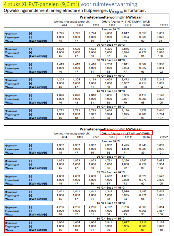 - Het energiegebruik object uit Vabi EPA is 100,55 kWh/m² en laat zien dat je voor 4 stuks XL PVT-panelen (9,6 m²) in de tweede tabel op bladzijde 10 van de kwaliteitsverklaring moet kijken, want hierin staat voor een energiegebruik groter dan (>) 41,67 kWh/m².
