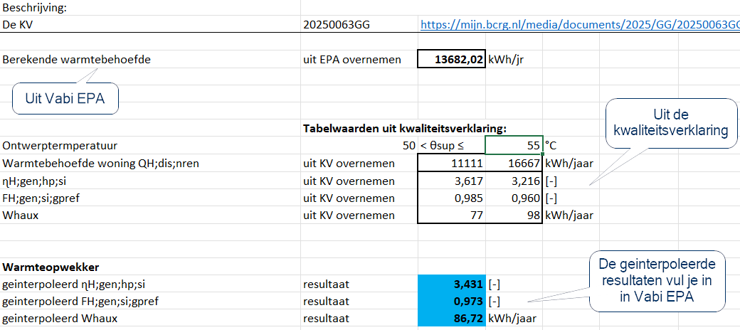- De bruto warmtebehoefte in dit project is 13682,02 kWh/jaar. Daardoor moet je dus interpoleren tussen een warmtebehoefte van 11111 kWh/jaar en 16667 kWh/jaar op de kwaliteitsverklaring.