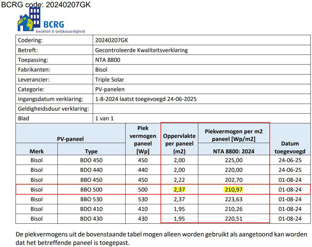 De kwaliteitsverklaring van het PVT-systeem (bladzijde 2) zegt dat er wordt verwezen voor de elektrische opwek van de PVT-panelen naar de volgende kwaliteitsverklaring voor Bisol PV-laminaten, 20240207GK.