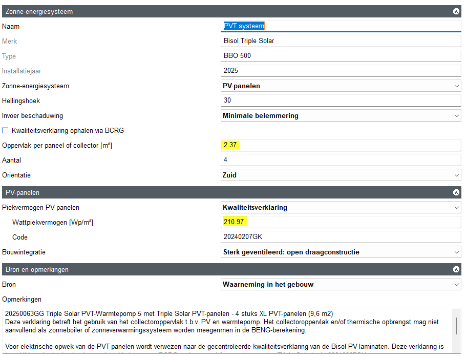 Voor type BBO 500 vul je een oppervlakte van 2,37 m² en een Wattpiekvermogen van 210,97 Wp/m² in. In Vabi EPA vul je dit als volgt in: