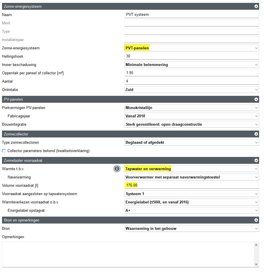 Je moet het PVT-systeem dan forfaitair invullen voor zowel tapwater als de zonnecollectoren, zie onderstaande invulinstructie bij "Zonne-energie zonder kwaliteitsverklaring (PVT)".