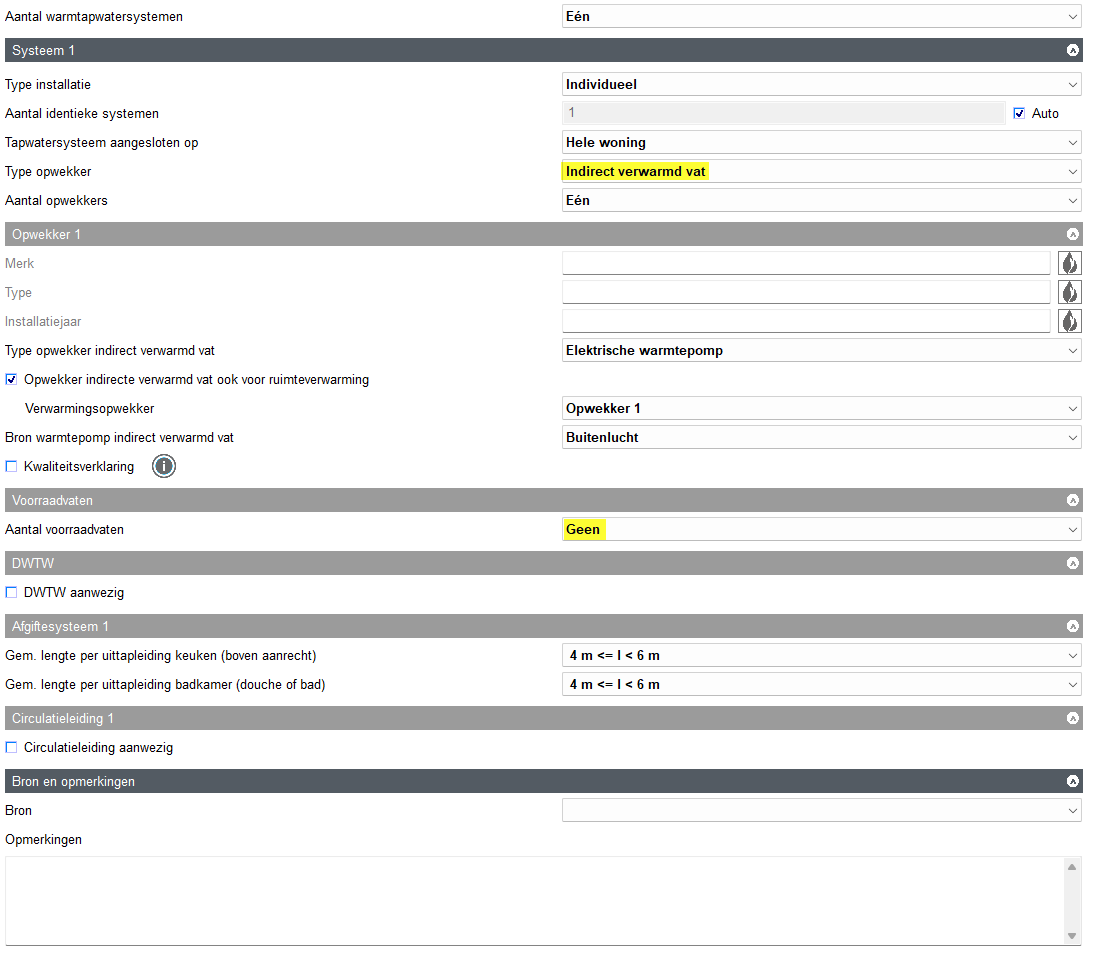 - De opwekker van het indirect verwarmde vat is elektrische warmtepomp, kies bij de bron buitenlucht (de NTA8800 rekent warmtepomppanelen door als buitenlucht).