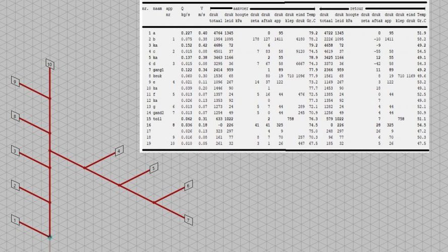 Met deze gegevens worden de temperaturen per leiding berekend, waarna de nieuwe soortelijke massa, viscositeit en soortelijke warmte worden berekend. Dan wordt de berekening nog eens opnieuw uitgevoerd met de nieuwe temperaturen. Deze berekening heeft niet de intentie te worden gebruikt voor het berekenen van vloerverwarming omdat daar nog veel meer gegevens voor nodig zijn. De leidinggegevens zien er dan als volgt uit: