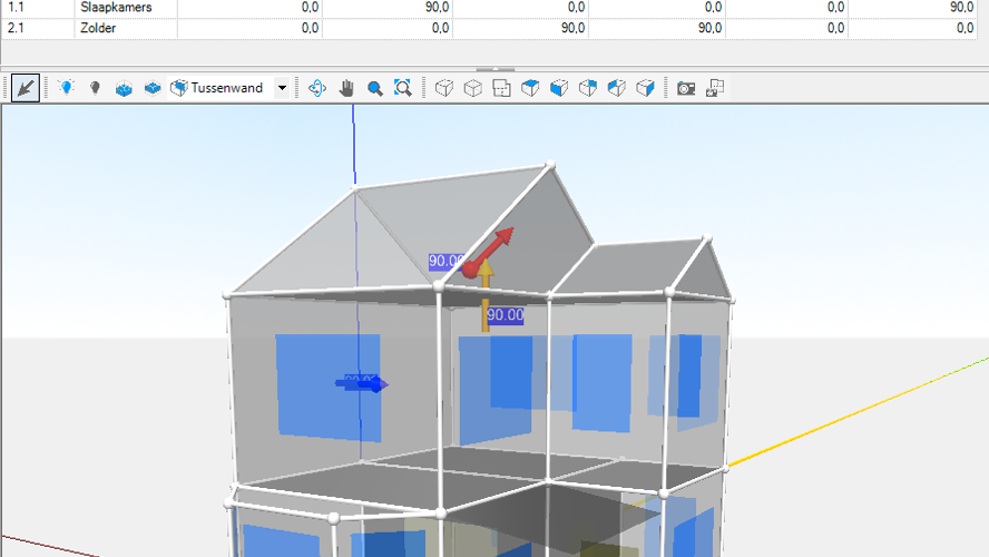 Gebruik de module ventilatiestromen voor gebouwsimulatie en warmteverlies om de luchtstromen door je gebouw inzichtelijk te krijgen. In de tabel en 3D weergave zie je direct hoe de luchtstromen lopen die jij ingevoerd heb. De gele pijl geeft overstromen aan, de blauwe pijl geeft luchttoevoer aan en de rode pijl lucht afvoer. Van deze weergave kun je ook eenvoudig plattegronden genereren waar per verdieping een 2D met de luchtstromen wordt opgeslagen in je projectinstellingen.