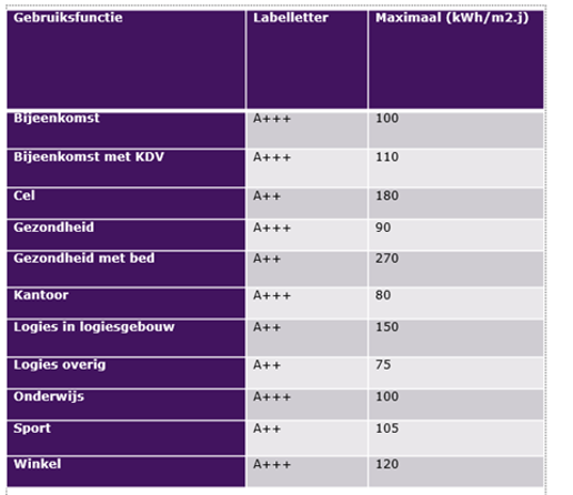 - % m2 per gebruiksfunctie vermenigvuldigen met de renovatiestandaard van de betreffende functie, conform onderstaande tabel (minimale waarde van de label letter A++ of A+++ van de betreffende gebruiksfunctie).