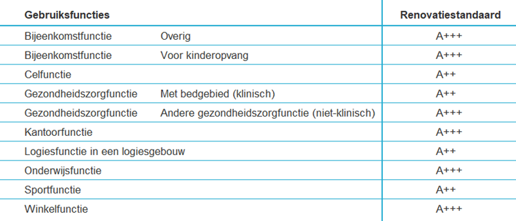 De standaard voor woningen kijkt naar isolatie, infiltratie en het ventilatiesysteem voor de netto warmtebehoefte, met als doel spijtvrij isoleren als voorbereiding op aardgasvrije woningen. De renovatiestandaard voor utiliteitsgebouwen kijkt naar de labelklasse. Als je gebouw voor 2030 aan de renovatiestandaard voldoet, dan is die (minimaal) tot 2050 energiezuinig. De renovatiestandaard varieert van een label A++ of A+++ afhankelijk van de gebruiksfunctie, zie tabel 1. In 2050 zal er een wettelijke eindnorm zijn, deze eindnorm geeft aan tot welk niveau een gebouw verduurzaamd moet worden.