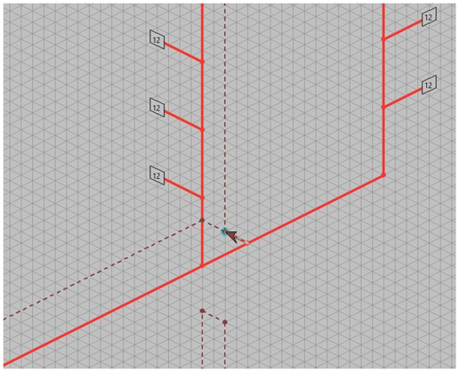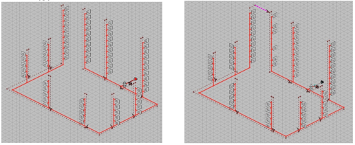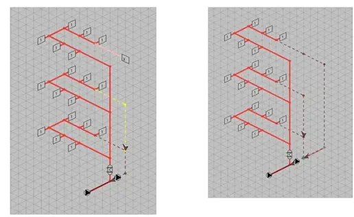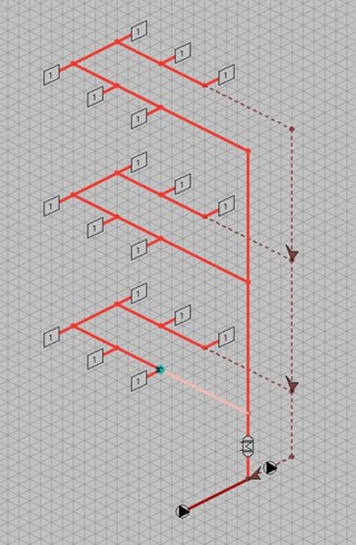 - Deze methode is nu ook geschikt voor een Tichelmann systeem. Normaal uitgangspunt voor een Tichelmann is om de inregeldrukken op 0 te krijgen maar doordat de aanvoer verschillend is van de retour wordt met deze methode de inregeldrukken toch aanzienlijk verlaagd. Volgend voorbeeld is geen Tichelmann maar heeft toch een afwijkende aansluiting. Hierdoor neemt de druk wel af maar gaat wel ten koste van extra leidingen.