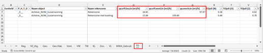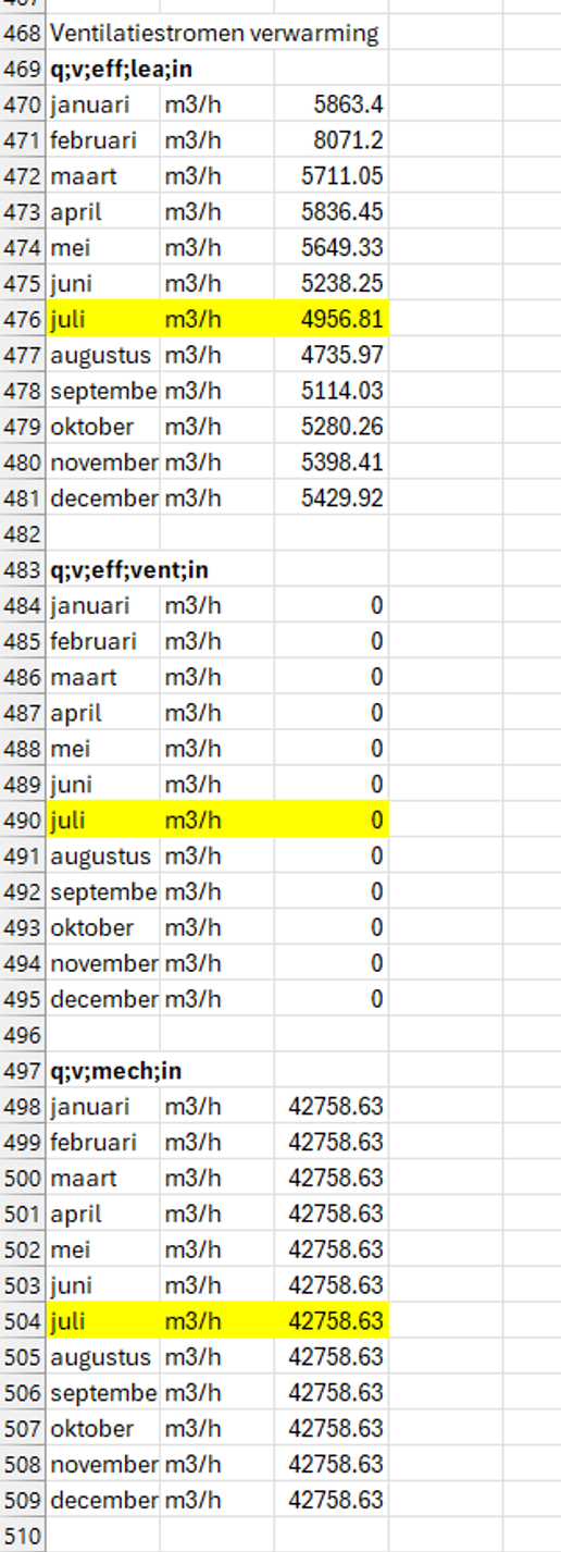 In deze resultaten.csv zijn de drie benodigde waarden terug te vinden onder q;v;eff;lea;in, q;v;eff;vent;in en q;v;mech;in. Hierbij dient dan de waarde genomen te worden die hoort bij de maand juli.