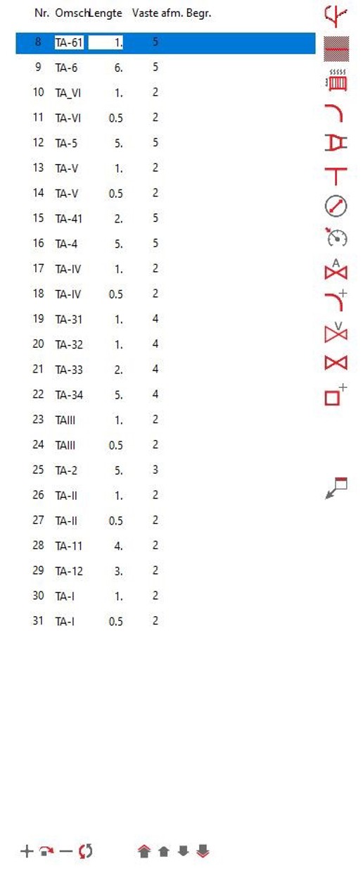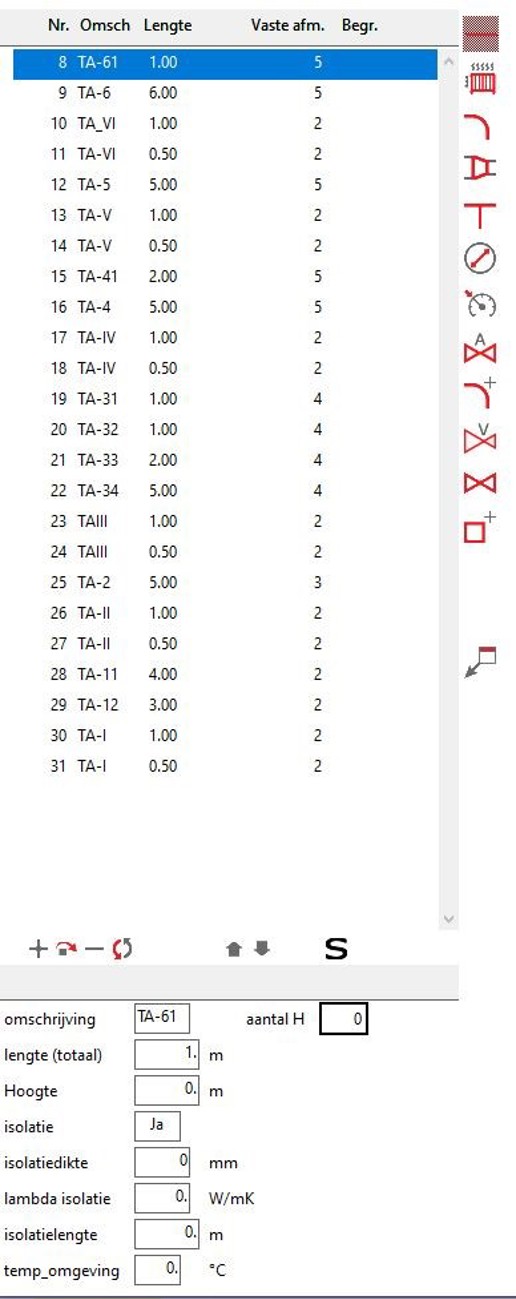 Wanneer je een nieuw project opent, is het invoerscherm nog niet aanwezig. Wanneer je een leiding tekent, verschijnt het invoerscherm, tegelijk met selectie in de lijst. Heb je een net getekend, dan kun je naar het invoerschermpje gaan om bijvoorbeeld de lengte aanpassen. Met <PgUp> of <PgDwn> kun je naar de volgende leiding, terwijl je in hetzelfde invoerveld blijft. De lengte zal in de lijst gelijk aangepast worden. Met de pijltjes kun je gewoon door de invoervelden lopen.