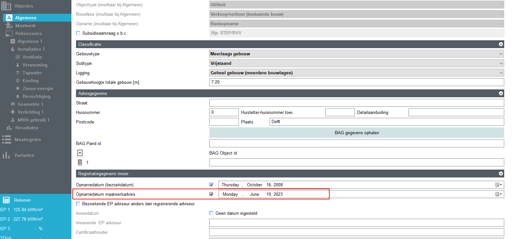 Het registreren van het maatwerkadvies kan makkelijk vanuit de software. Bij de algemene gegevens moet hiervoor wel nog een opnamedatum van het maatwerkadvies worden opgegeven. Dit is de datum waarop de gegevens voor het maatwerkadvies zijn verzameld en kan mogelijk afwijken van de opnamedatum van het gebouw.