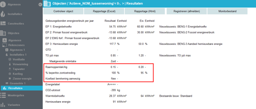 In het resultatenscherm (afbeelding 1) is te zien wat de verhouding van het glas tot gebruiksoppervlakte is en hoeveel procent van de ramen op de nodige oriëntaties een voldoende beperkte zontoetreding heeft: