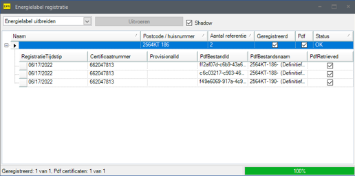 Om vanuit EP-Online een overzicht te krijgen welke woningen op basis van referentie zijn geregistreerd kan een rapportage worden gedownload. Voor de gelijkende woning die op basis van referentie geregistreerd zijn, staat dit aangegeven. In de tweede screenshot hieronder in de meest linker kolom: Label op basis van referentie. Voor de representatieve woningen staat deze op ‘Nee’.