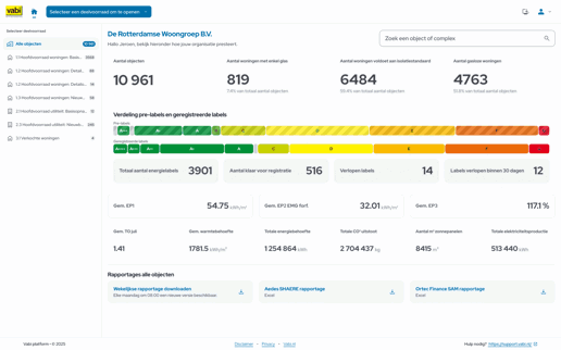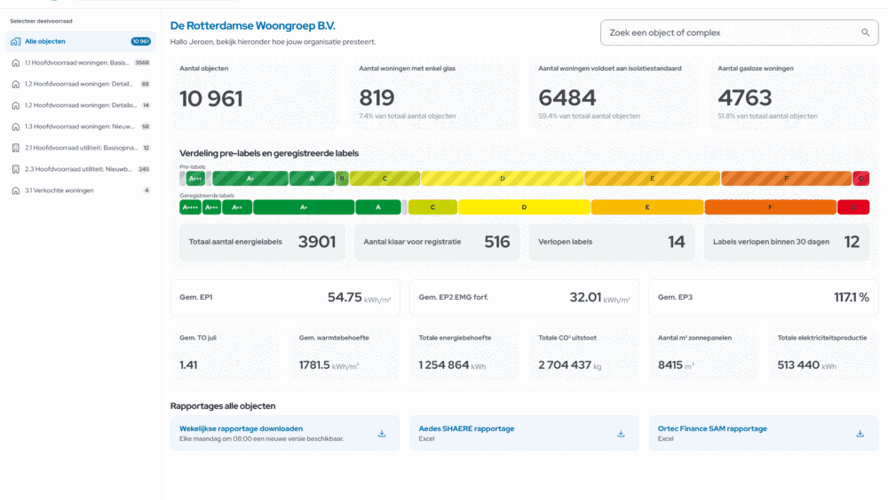 Het dashboard geeft je daarnaast inzicht in kerncijfers zoals energiebehoefte, CO₂-uitstoot, totale opwekking uit zonnepanelen en meer. Wil je verdere analyses doen? Met één druk op de knop download je een van de rapportages voor de gehele voorraad of een specifieke deelvoorraad.