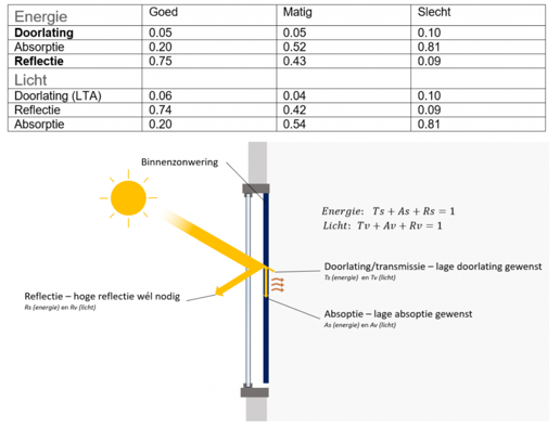 Bij binnen zonwering is de mate van reflectie belangrijk, waarbij een hogere reflectie zorgt voor een lagere doorlating van energie. Bij binnen zonwering is het namelijk niet gewenst om een hoge absorptie te hebben, omdat je dan grote stralingsvlakken creƫert.