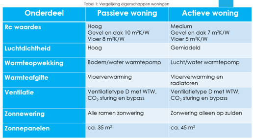 De twee voorbeelden hebben eenzelfde geometrie en verschillen in isolatiewaarde (de passieve woning heeft een hogere Rc waarde) en installaties. In de tabel hieronder ze je de verschillen per woning.