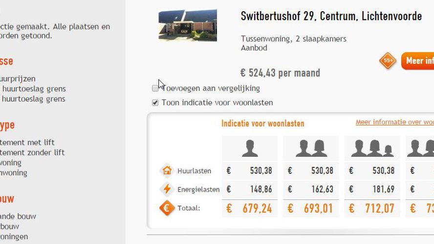De woonlastenindicatie wordt niet alleen bij de details van een woning getoond, maar ook direct in de lijstweergave. Hierdoor krijgt de woningzoekende direct een compleet beeld van de betaalbaarheid van de woning.