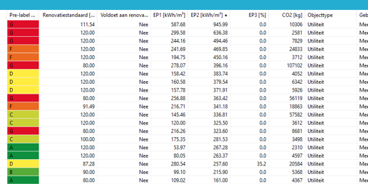 Net als bij de isolatiestandaard voor woningbouw, wordt in Vabi Assets Energie direct getoond of het object voldoet aan de renovatiestandaard, en kan er op deze eigenschap ook gefilterd worden: