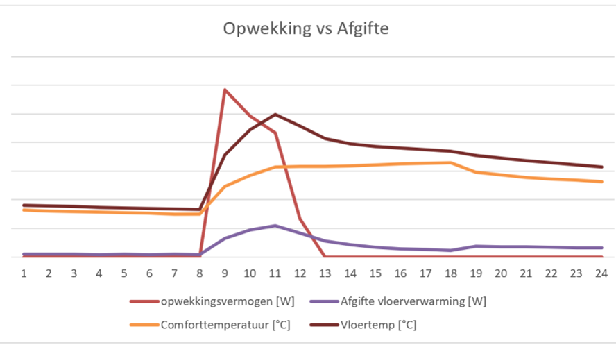 Omdat vloerverwarming een traag systeem is, heeft het te leveren verwarmingsvermogen een minder directe relatie met de vertrekluchttemperatuur dan je denkt. Op het moment van intreden (setpoint van 21.5 [°C]) is de vloer te koud, en is er veel vermogen nodig om de betonmassa op de gewenste verwarmingstemperatuur te krijgen.
