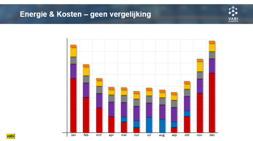 Naast de statistieken is er een maand of jaargrafiek te maken met de verbruiken per energiedrager of gebruik. Met name de maandgrafiek biedt veel inzicht en is toe te passen om inzichtelijk te maken of nul-op-de-meter van toepassing is in het berekende project.