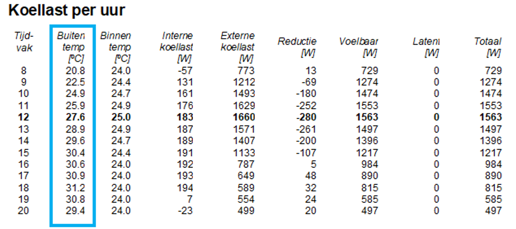 In een koellastberekening wordt per ruimte het benodigde koelvermogen bepaald. Hierbij wordt over één dag ieder uur de benodigde koeling berekend én wordt er voor deze dag naar 5 verschillende maanden gekeken: mei, juni, juli, augustus en september. De buitentemperaturen (per uur over een dag) in deze 5 maanden zijn vastgelegd in NEN 5060 zoals in de figuur hieronder (tabel C.3 uit NEN 5060).