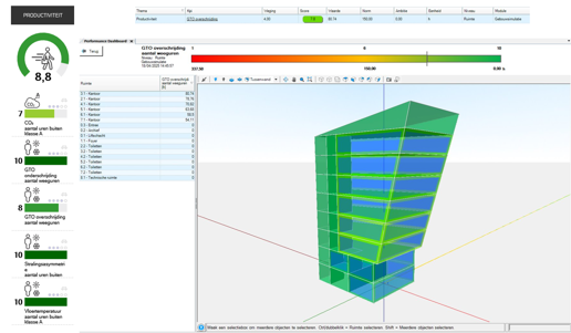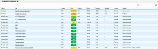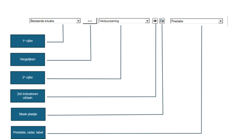 Het performance dashboard kan gebruikt worden om in één oogopslag de prestaties van een model inzichtelijk te maken. Het is ook nog mogelijk om twee situaties naast elkaar te zetten zodat bijvoorbeeld de invloed van verduurzamingsopties op de bestaande situatie duidelijk gemaakt wordt.