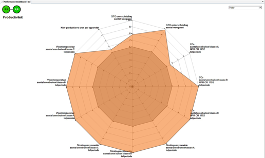 De overall score is hier 8,5. Als je nu een onderwerp kiest, bijvoorbeeld Productiviteit, dan worden álle indicatoren weergegeven in een radar. Ook degene die met het “oogje” uitgezet zijn.