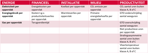 Kies je voor de weergave radar dan krijg je een overzicht van de scores op de 5 hoofdstukken: Installatie, Productiviteit, Financieel, Milieu en Energie.
