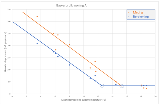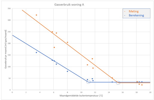 De laatste stap in het fitten is het bepalen van de stookgrens. Dit is gelijk aan de warmtebalans van het object; bij deze temperatuur zijn de warmtewinst en verliezen met elkaar in evenwicht. Wordt het kouder (verliezen groter) dan is er extra energie nodig om de setpoint temperatuur te behalen.