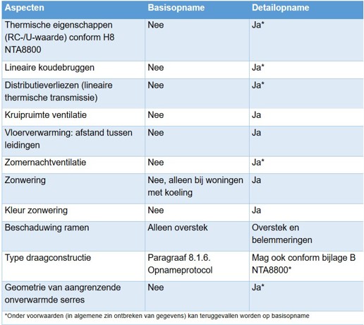 Dit verandert in de NTA 8800. De NTA 8800 schrijft voor dat als informatie beschikbaar is deze toegepast moet worden. Onder voorwaarden (vaak als informatie ontbreekt) mag zowel voor de basisopname als de detailopname ‘ingeklapt’ worden. Dit kan zowel voor constructies als voor installaties toegepast worden.