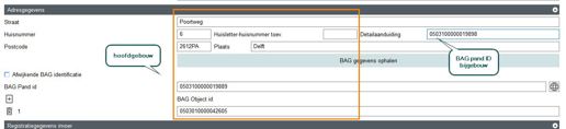 Voor utiliteit is het nog wel mogelijk om een detailaanduiding te gebruiken, voornamelijk voor gebouwen die geen eigen verblijfsobject ID hebben, meestal zijn dat bijgebouwen. Je vult dan het adres en BAG ids van het hoofdgebouw in en het pand ID van het bijgebouw dat je gaat registreren vul je bij detailaanduiding in.
