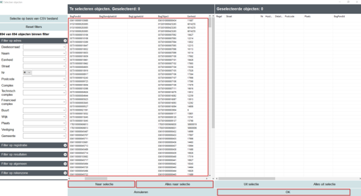 Selecteer vanuit de ‘’Selecteer objecten’’ scherm de objecten waar je de WWS punten wilt aanvullen en klik op ‘’OK’’ nadat je de gewenste objecten hebt geselecteerd.