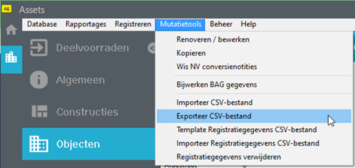 Na het exporteren van de overige WWS punten uit je ERP systeem kan je beginnen met het maken van het import bestand in Vabi Assets Energie. Dit kan gedaan worden door eerst de gewenste deelvoorraad in Vabi Assets Energie te openen en de functie ‘’Exporteer CSV-bestand’’ uit te voeren om het import bestand aan te maken.