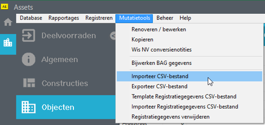Sla het CSV-bestand op en ga weer terug naar Vabi Assets Energie en selecteer de functie ‘’Importeer CSV-bestand’’ die ook gevonden kan worden onder de tabblad ‘’Mutatietools’’