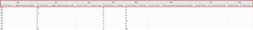 Na het exporteren van het CSV-bestand zie je de WWS gegevens staan vanaf kolom ‘’PuntenTotaal : 1. Oppervlakte vertrekken’’ (BS) t/m kolom ‘’PuntenTotaal : 10. Renovatie’’ (BZ). Vul de WWS punten uit de ERP export in de juiste kolommen.