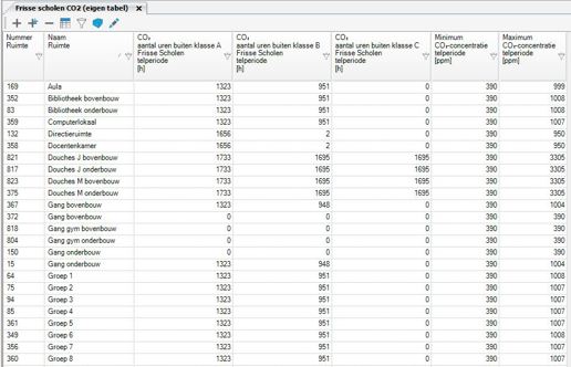 Voor het thema Lucht worden er eisen gesteld aan de CO2 gehaltes in de ruimten. Met Gebouwsimulatie worden de CO2 concentraties berekend. Door het maken van een eigen tabel kun je de resultaten hiervan inzichtelijk maken per ruimte. Zo kan je in één overzicht zien welke ruimte in welke CO2 klasse valt.