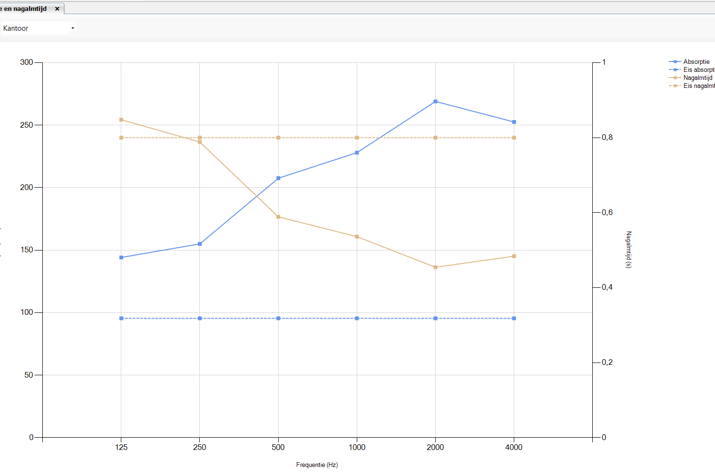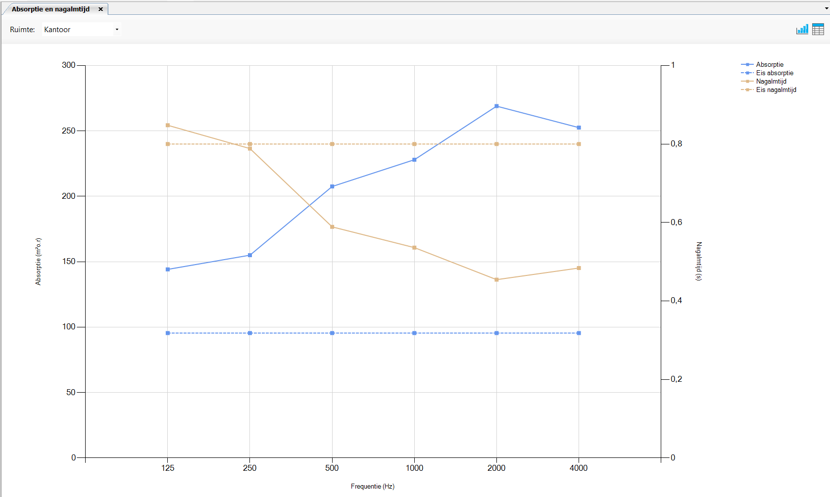 De resultaten van de geluidsabsorptie en nagalmberekening vindt u terug in het overzichtelijke technische dashboard. In ruimtetabellen vindt u de resultaten per ruimte en kunt deze exporteren naar Microsoft Excel. Ook wordt van elke ruimte een grafiek getoond met de eis per octaafband én het resultaat per octaafband. U ziet in één oogopslag of u voldoet aan de gestelde eis. Genereer diverse 3D weergaven van de resultaten voor een goed onderbouwd advies naar uw opdrachtgever.