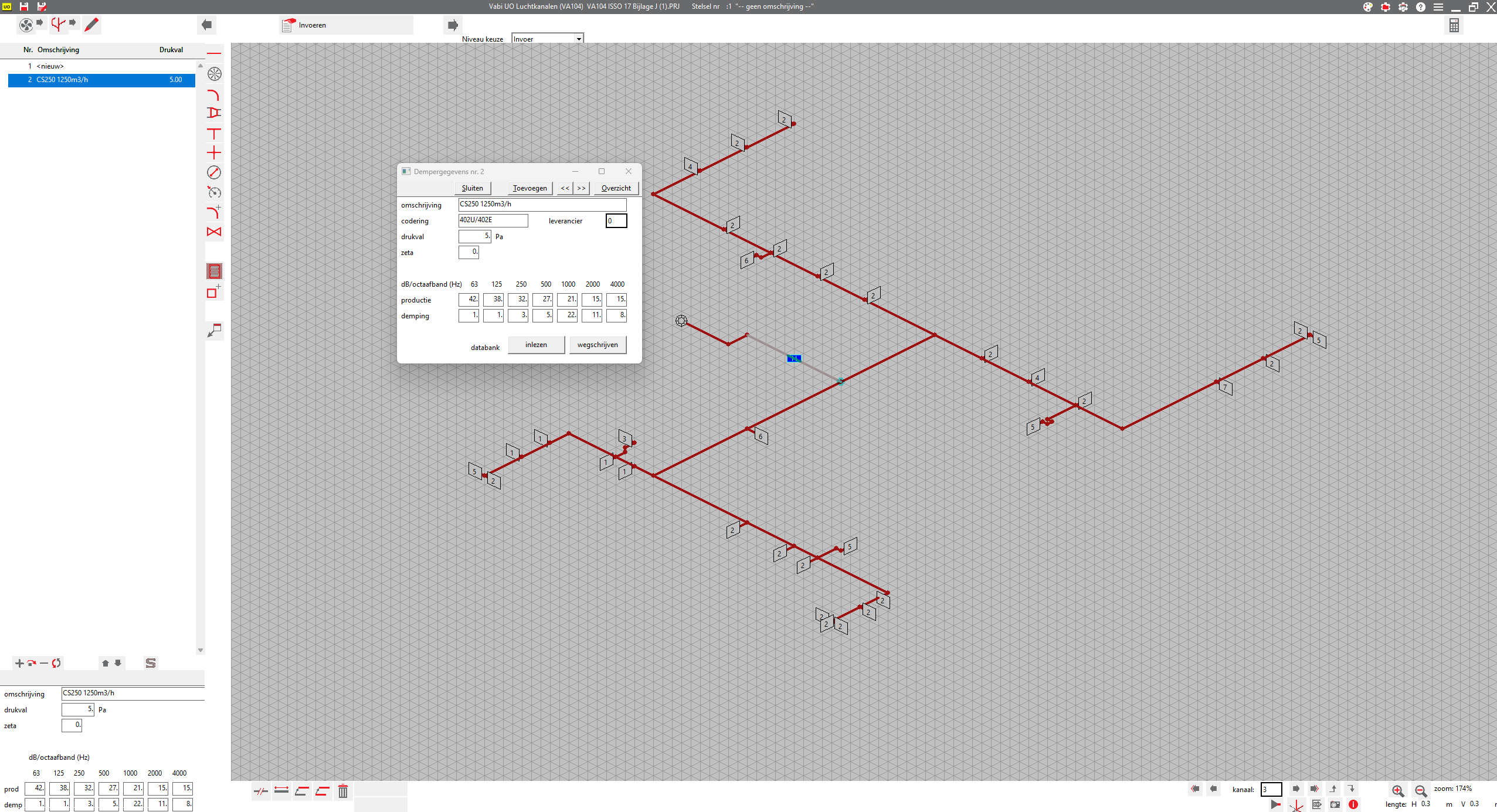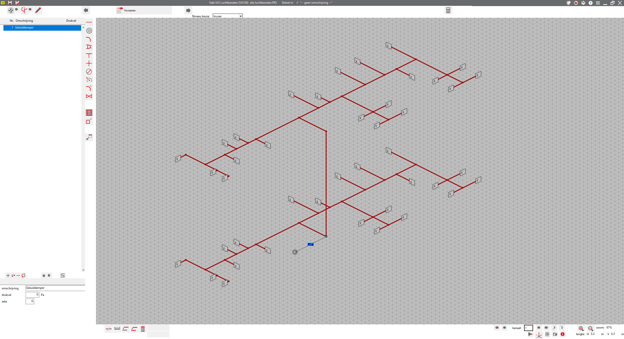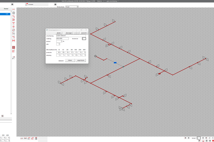 De module geluid in Luchtkanalen berekent de geluidsproductie in de kanalen, de overdracht van geluid naar een vertrek en demping veroorzaakt door de ventilator, bochten, T-stukken, roosters en overige hulpstukken aan de hand van ISSO-publicatie 24 (Installatiegeluid). Wanneer je een kanalennet hebt ingevoerd kun je per octaafband het aantal dB’s berekenen dat moet worden gedempt. Daarna kun je een demper kiezen en onderbouwen welke maatregel nodig is om aan de geluidseis in het vertrek te voldoen.
