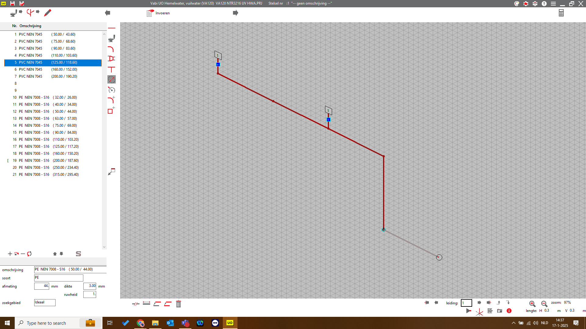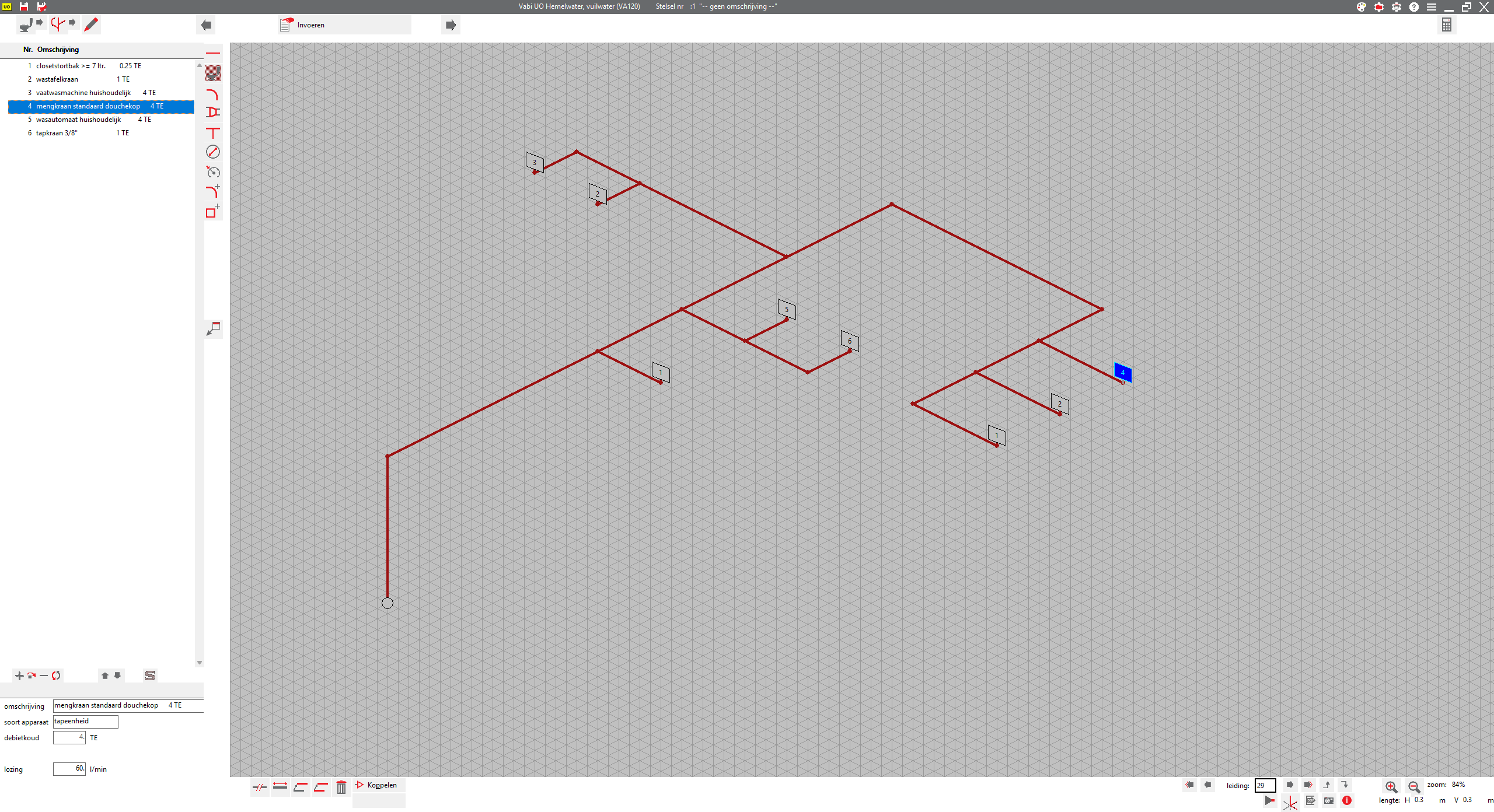 Het programma bepaalt middels jouw isometrische ontwerp automatisch of het een doorgaande of aftakkende leiding omvat. Geef je geen T-stuk op, dan kiest het programma automatisch het T-stuk of de bocht. Deze en nog meer slimme functionaliteiten ondersteunen je bij het dimensioneren van een afvoerstelsel.